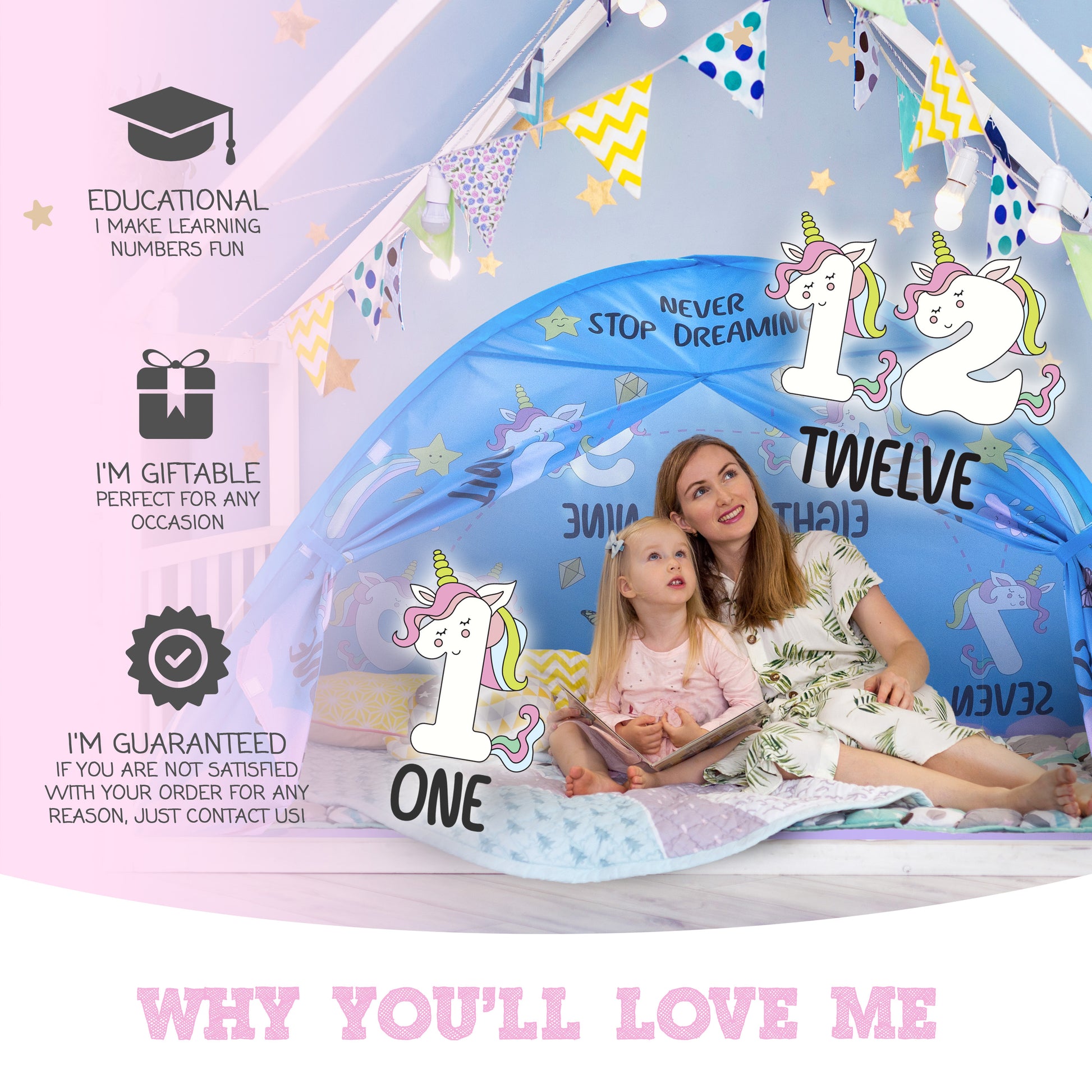 - SLEEP AND LEARN - Printed numbers 1-12 in the correct order and spelling. This tent bed full size playhouse provides a fun and educational way for your child to learn. Bedtime becomes a playful learning experience, igniting curiosity and improving spelling and number recognition in their play tent for bed kids