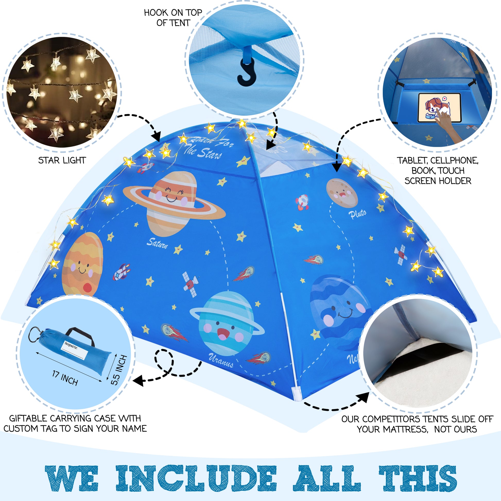 - ALL ACCESSORIES INCLUDED - Blast off in this interstellar toddler sleep tent, which features a touch friendly tablet holder, light hook, star string lights, and carrying case. Creating full size bed tent for kids results in a stellar time exploring the universe and cosmos
